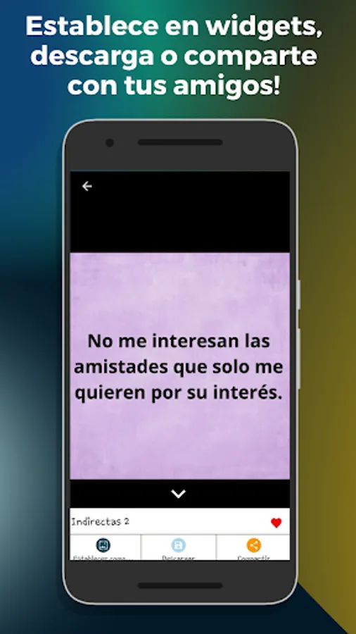 Esta aplicación va a permitir el uso de excelentes imágenes creadas de indirectas para diferentes usos y momentos. Podrás establecerlas como widgets, compartirlas a través de una red social o cualquier otro uso de su preferencia en tu dispositivo móvil