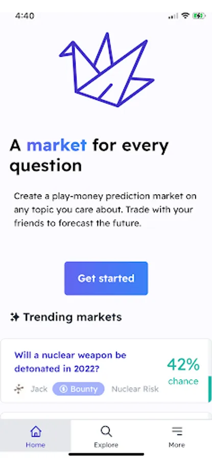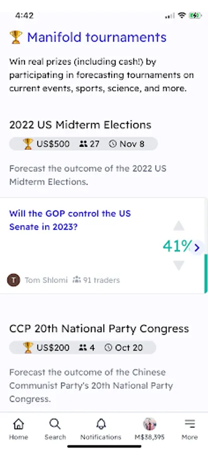 Check Manifold when you want to know the true chances of an event happening. If you disagree with the odds, bet on it and make play-money if you're right. Create a play-money prediction market on any topic you're curious about. Trade with your friends to forecast the future.