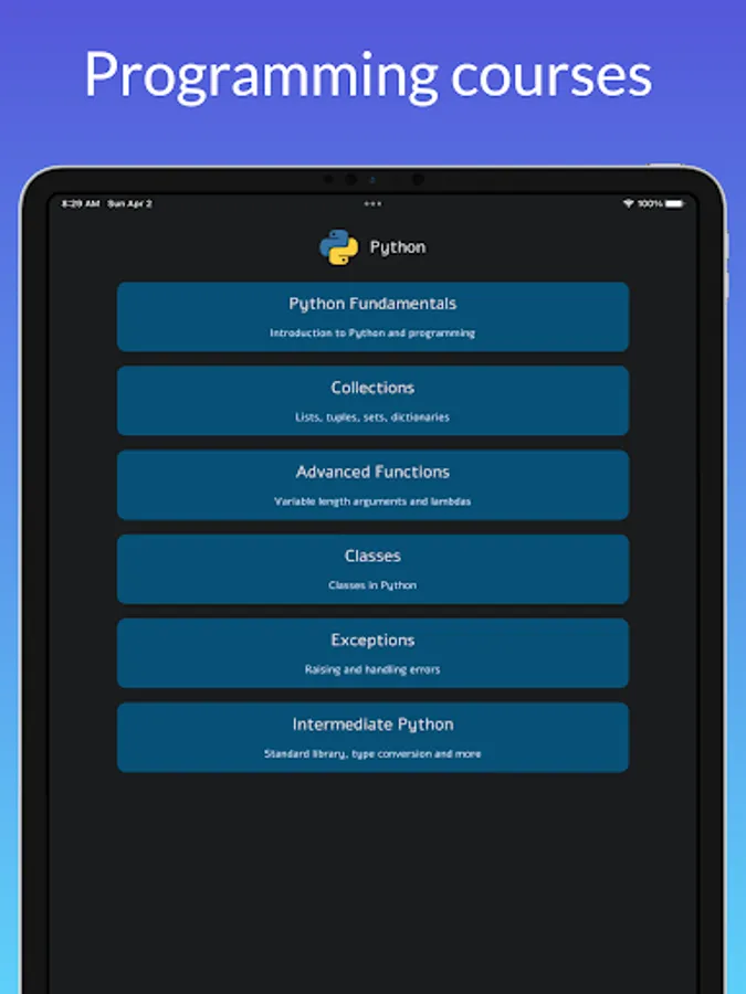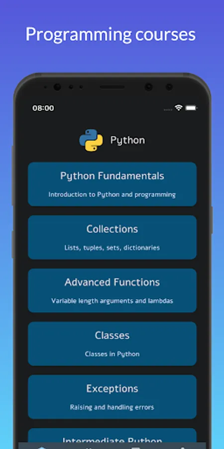 Welcome to Codesy – the ultimate coding and programming learning app! Learn Python programming with ease and confidence with our comprehensive programming courses. We cover the basics of coding with Python, a popular programming language used in web development, automation, data analysis, and more. Our lessons are designed to be easy to follow, with clear explanations and interactive quizzes to help you test your understanding.