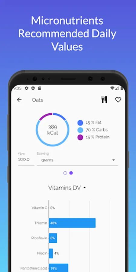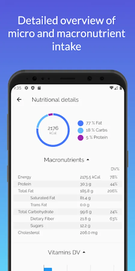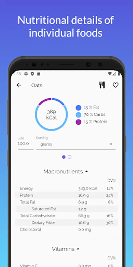 ● Track intake of all nutrients - calories, macros (carbs, fat, protein), sugar, fiber, cholesterol, vitamins, and more