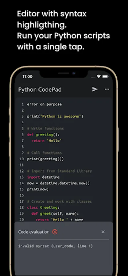 Lightweight app with full code syntax highlighting, just like a real Python IDE.