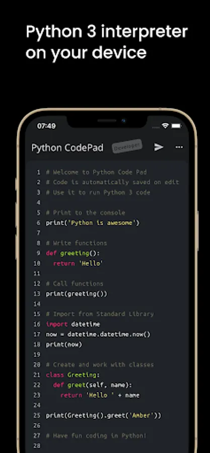 Whether you are a beginner or a professional, this app will help you improve your Python programming skills. Use this coding editor to become a Pythonista and better developer.