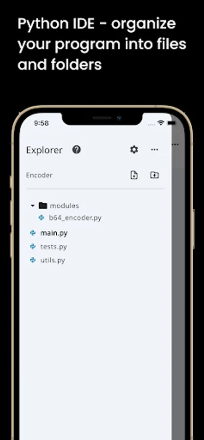 Work with multiple files, and organize your program into modules. The app works as a real IDE.