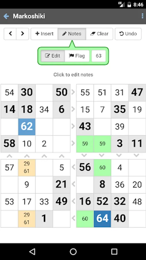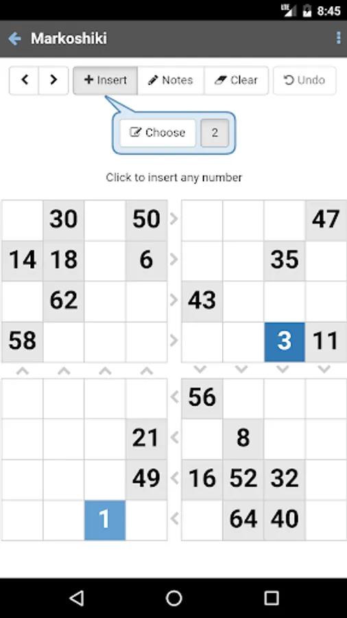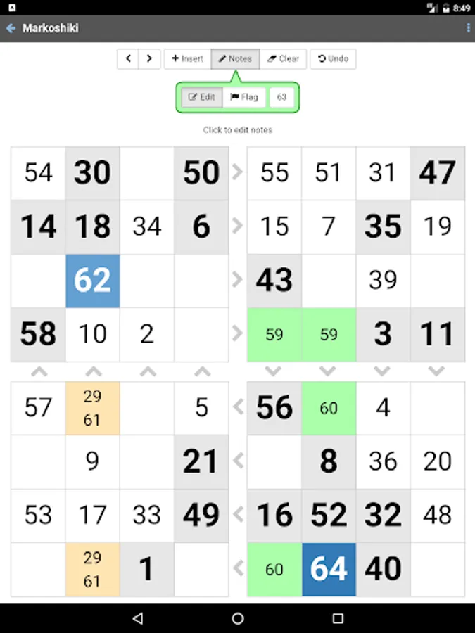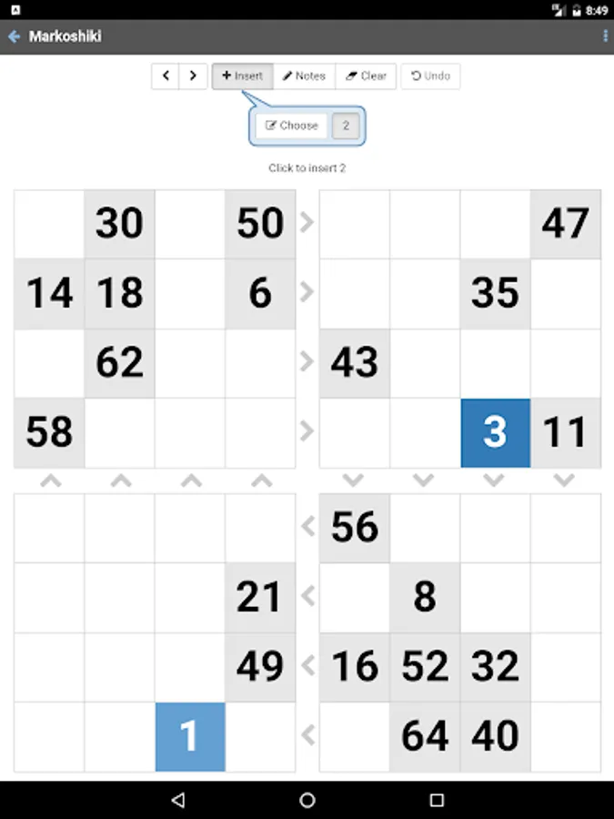 In Markoshiki you are presented with a board, split in four quadrants, with some numbers already in it. Your goal is to fill the missing numbers using the existing ones as hints.