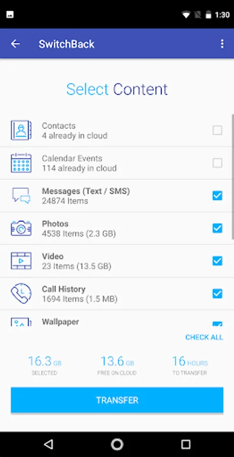 SwitchBack helps you move contacts, calendars, photos, videos, device settings and more to your new Android device from your old iOS or Android device.