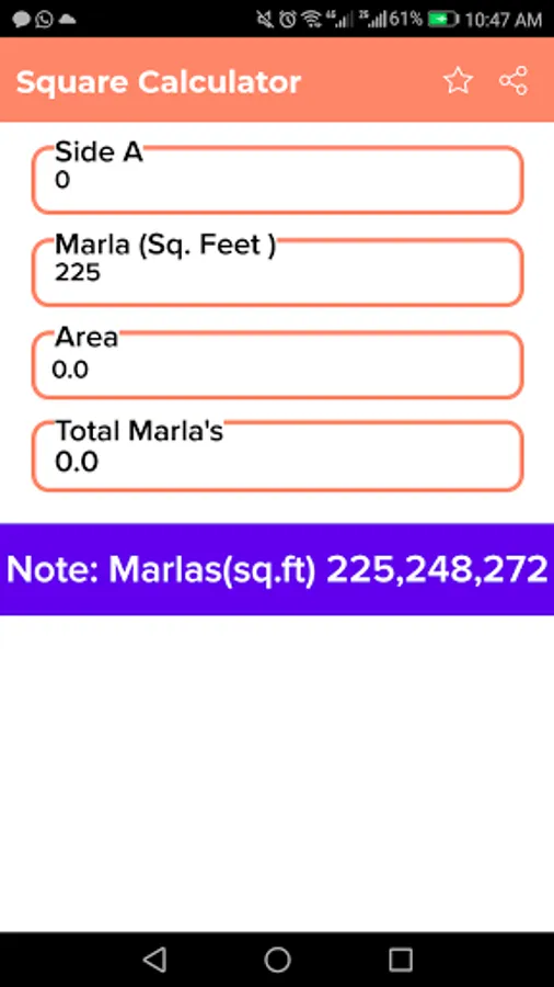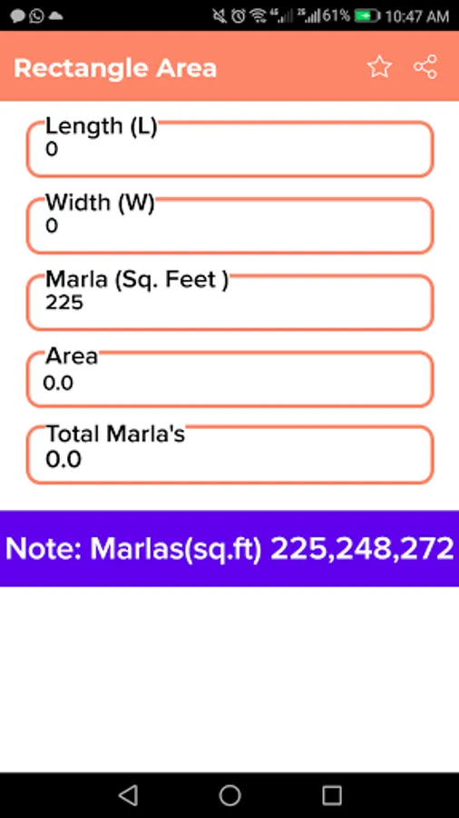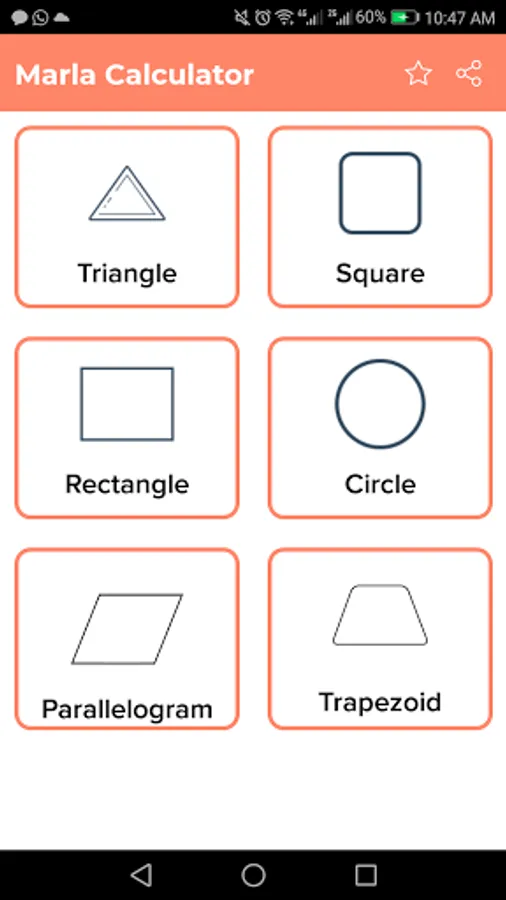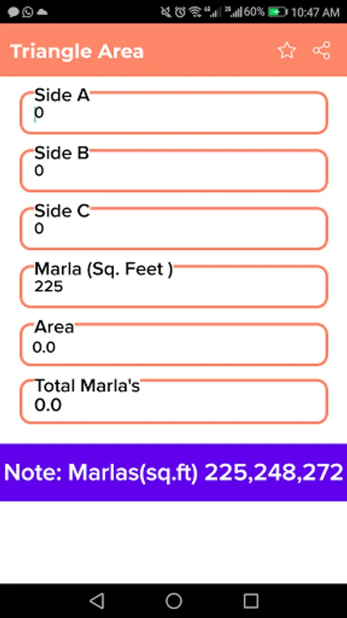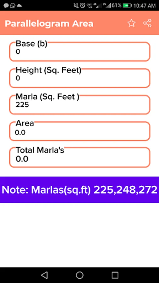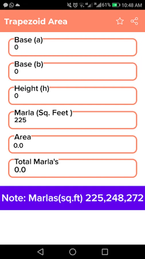 Marla Calculator app converts different shapes (circle, square, parallelogram, trapezoid, rectangle, triangle) of areas into Marla's easily. Every person can also change the size of Marla (225,248,272) while calculating Total Marla's. Our app will help all those persons who can work in different fields and they want to calculate the area of different shapes and marlas also.