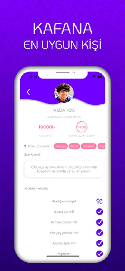 • According to the answers to 10 questions you give us, we find the most suitable people for you and bring them to you.