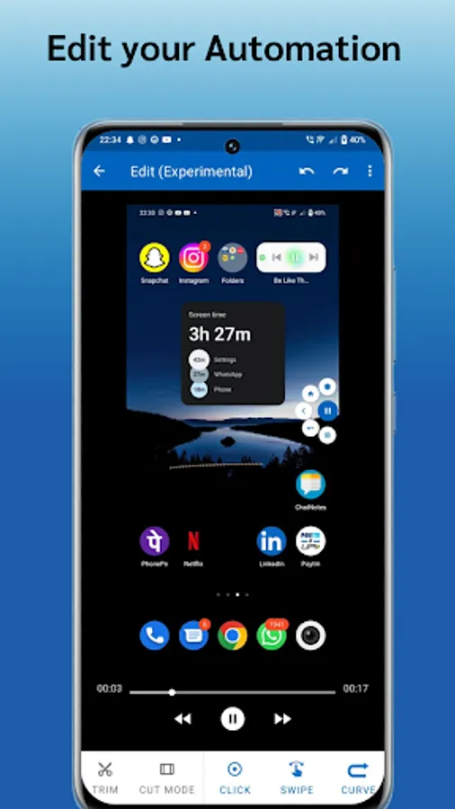 - Editing : Take your automation to the next level with our advanced editing capabilities. The app provides a comprehensive set of editing tools to enhance your automation to allow you to cut/trim, add more swipes/clicks, and customize the speed and number of repetition
