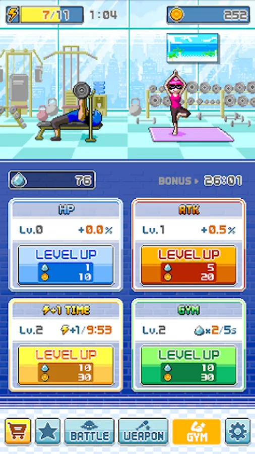 > Strengthen your hero in the gym, gain crystals that increase every 5 seconds!