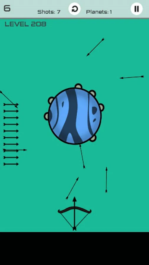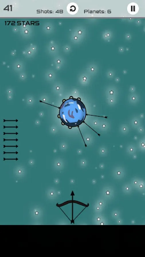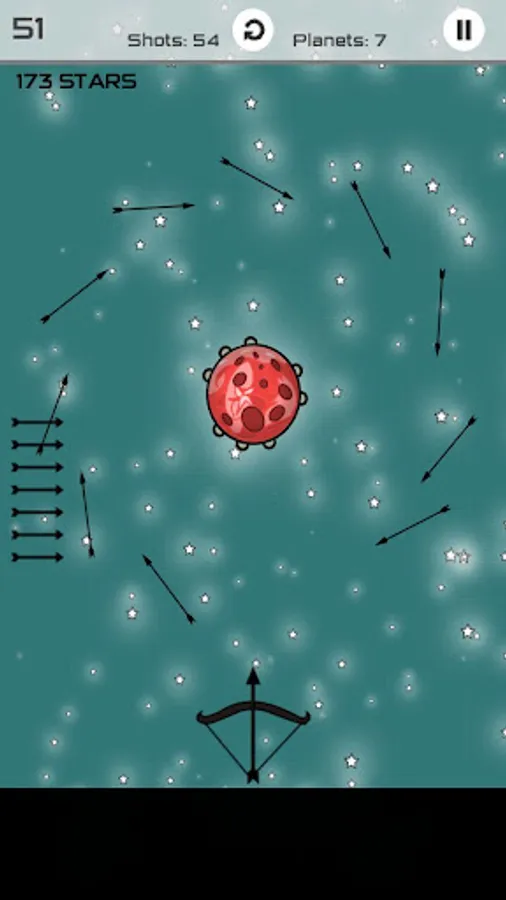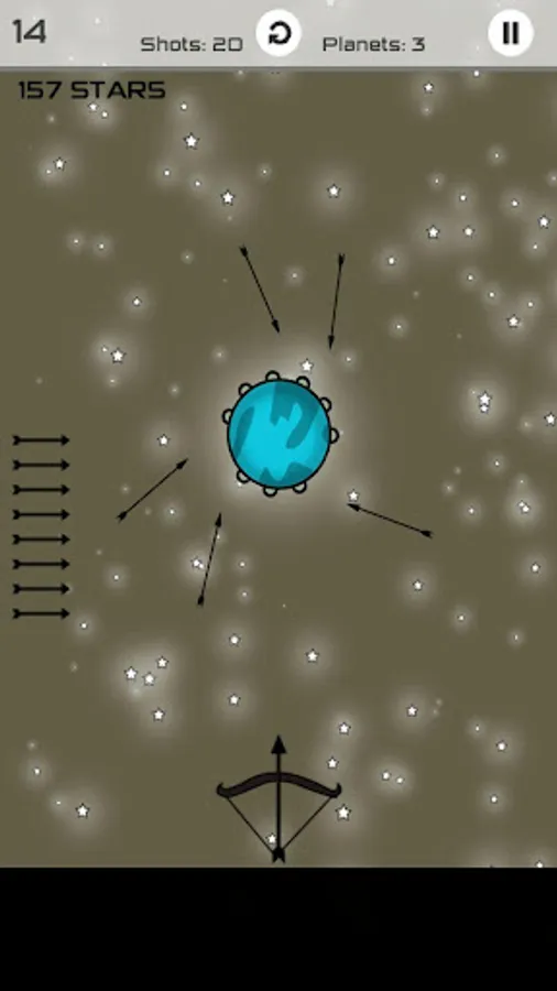 Archery Moon is an adventure game with levels. 1 level is equal to 1 star in the universe. Shoot the bulging round button with arrow on each planet contiguously to complete 1 level.