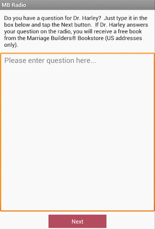 The Marriage Builders Radio app is also you way to submit a question directly to Dr. Harley. And as a BONUS, if your question is answered on the radio program, you will be sent a free book from Marriage Builders!