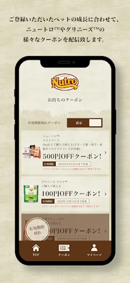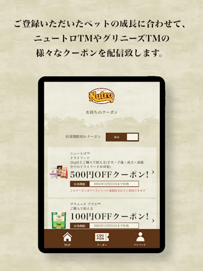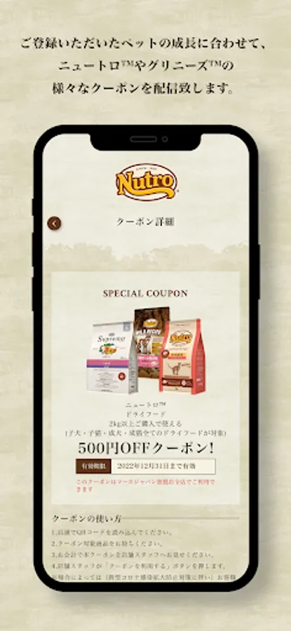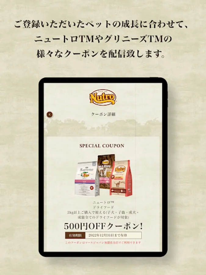 As your pet grows, we will deliver various coupons for Nutro ™ and Greenies ™. Please use all means!