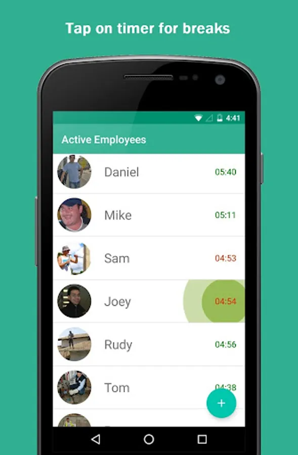The first screen will display active employees (employees who are currently working). The time starts to run for employees on this list. To remove an employee from this list (clock out), simply swipe right or left, then the time will stop running for that employee. For breaks, tap on the timer of a particular employee, and it will pause/resume the time.