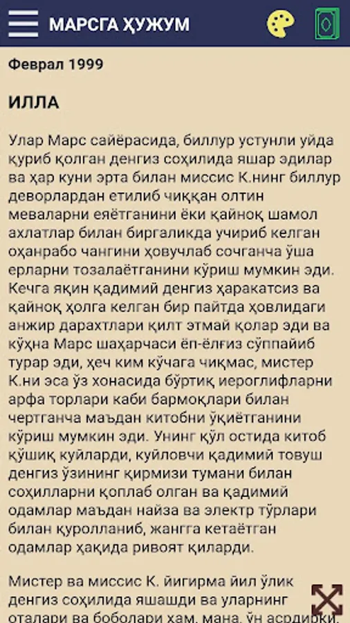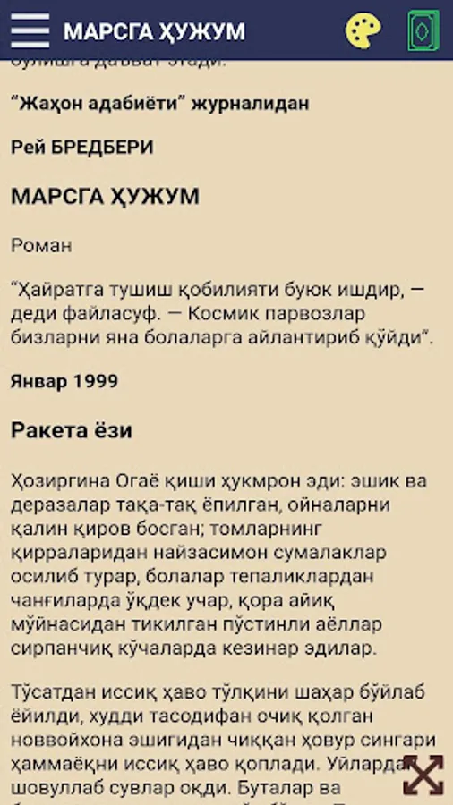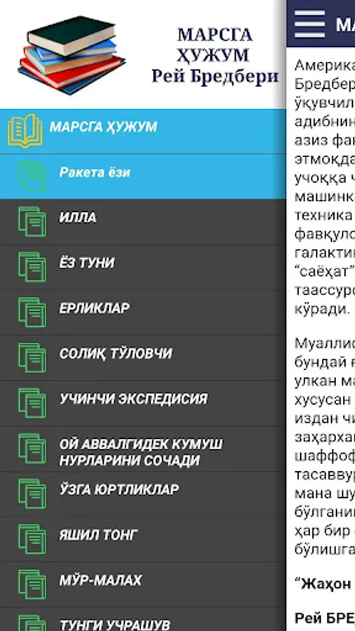 Amerikaning mashhur fantast yozuvchisi Rey Bredberining nomi va asarlari o‘zbek o‘quvchilariga ham yaxshi tanish. Endi adibning shoh asari «Marsga hujum»ni siz aziz fantastika ixlosmandlariga havola etmoqdamiz.