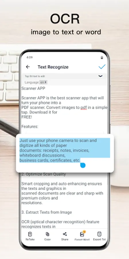 • Extract texts from Image OCR, transfer image to text so you can search, edit or share.