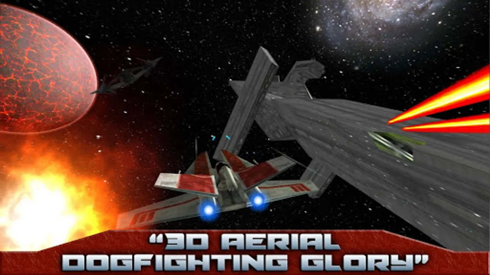 Join up with Alpha Squadron and take on the evil Hadian Empire in this 3D Action flight game. With missions set in deep space as well as planetside sorties versus hordes of enemy fighters and capital ships, you will be immersed in the intergalactic conflict! Dogfight with enemy spaceships flying amidst beautiful floating cities, desolate desert planets and dangerous asteroid belts as you fight to stay alive and protect your fleet. Dodge the laser combat blasts as you provide cover for a planetary evacuation, capture an Imperial General and rescue prisoners of war. Launch your starfighter through a thrilling tunnel chase in a race against time to stop a galactic superweapon of doom! Awesome cinematic graphics and intense action packed gameplay!