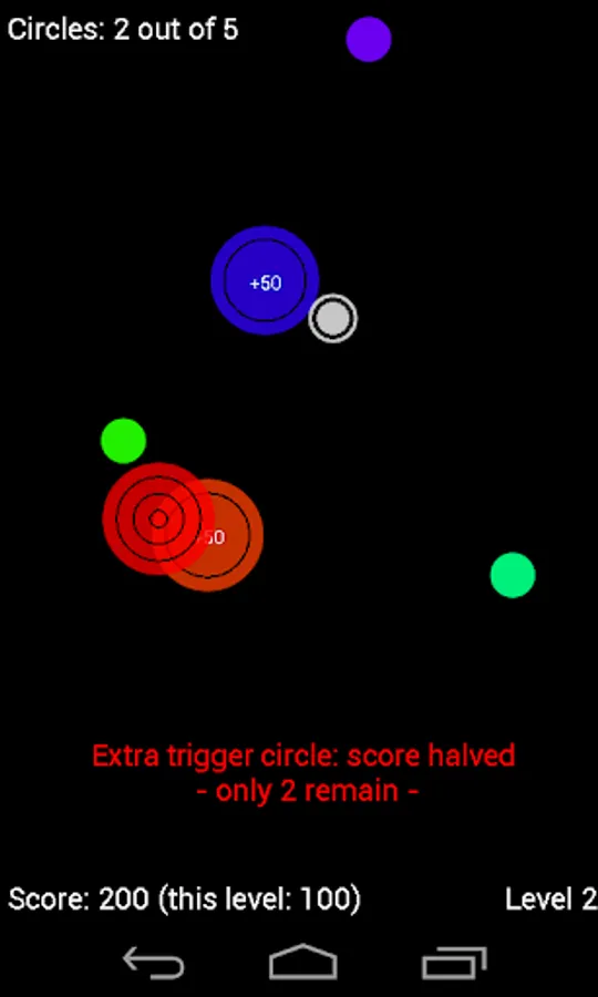When you tap the screen a Trigger Circle is placed. You can earn Spare Triggers (aka Spare Squishies) for being "super-awesome at Circle Squish" (keep reading). When a circle/ball/bubble/blob/whatever-you-want-to-call-them floats into another squashed bubble/circle/ball/blob/oh-you-get-the-idea it too will explode and become "squished" - this is the aforementioned "chain reaction". Each explosion, each squished circle, gives you points. The points will make you happy and are a measure of the fun you're having. More points = more fun (a bit like a driving license, but without the disapproval). Each explosion gets roughly 50% more points than the squashed bubble it has collided with. If another ball collides with that it'll be 50% more again. It is this that makes the winners. That can be a lot of points. And points are? FUN.