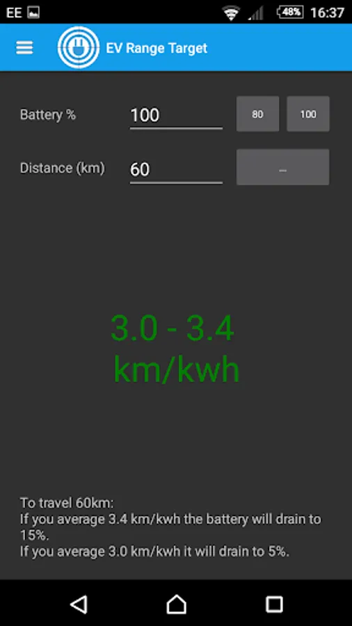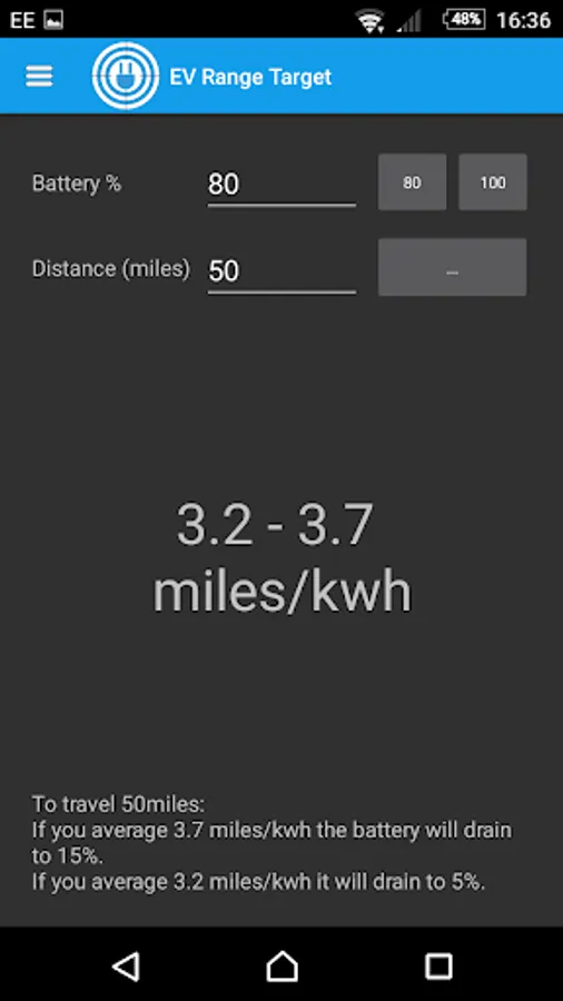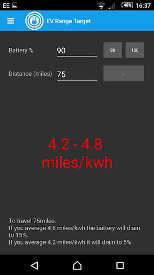 Let’s say you’ve charged to 90% and need to travel another 70 miles. Simply plug in those two numbers and it’ll tell you that at an average of 3.7 miles/kwh you should arrive at 5% charge and at 4.2 miles/kwh you will arrive at 15%.
