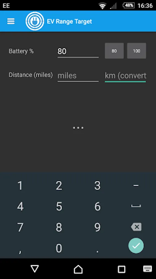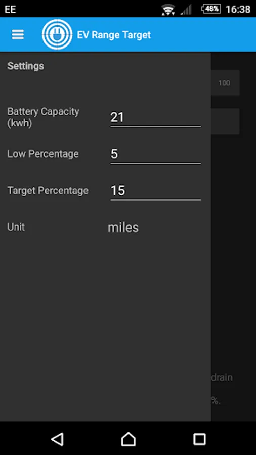 Set your own battery target percentage, low-threshold percentage, battery capacity and unit (km or miles).