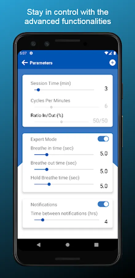 The expert mode allows you to specify the exact breath-in, breathe-out time and adds a holding time.