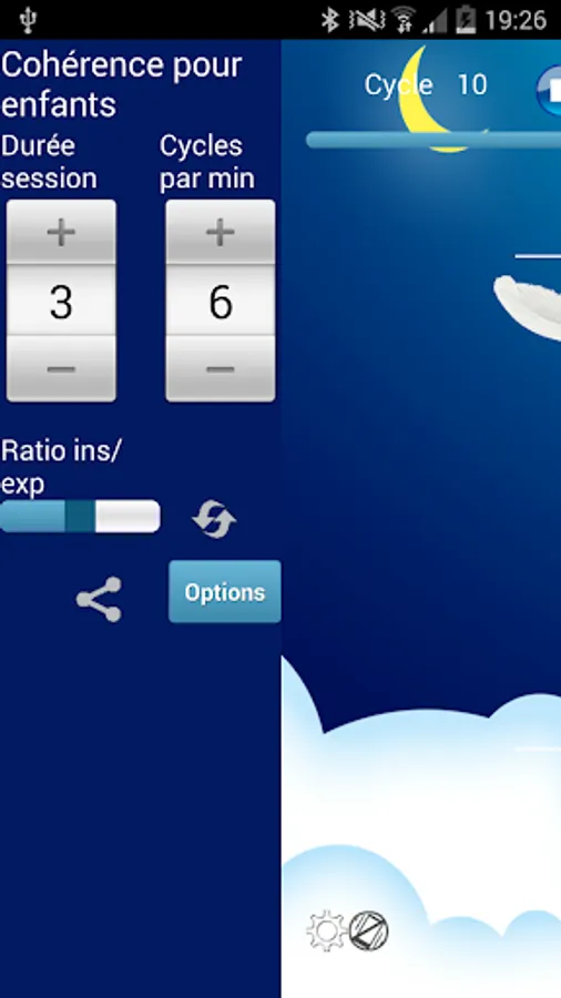 A menu allows you to specify the duration of the exercise and the number of breath per minute. Each session can be configured !