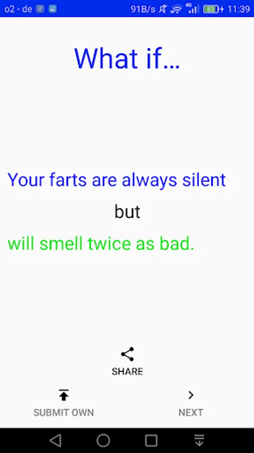 You can submit your own ideas in order to make the game better and increase the amount of questions! This way the app will grow and therefore more people submit their creative ideas and leave you with even more content!!