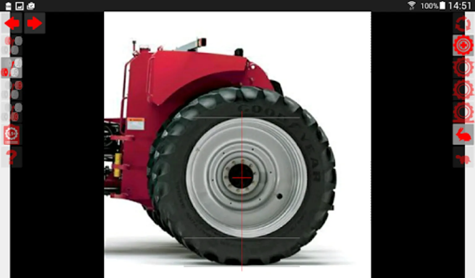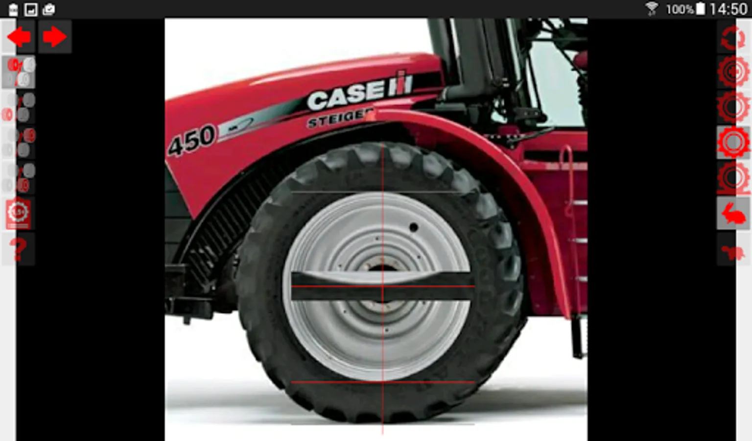 • To advance the evaluation of the equipment must be adjusted with the pressures of the tires according to the machine manufacturer's manual and or tires. Place the machine on firm and level ground without incidence of shadow on the basis of tires for better identification of the soil in the images, if required drive the machine so that pictures have similar lighting. In the case of very dark soils it is recommended to select the base tire with white chalk for better identification of the tire contact with the ground threshold. The effective reading is valid for the conditions of weight and tire pressures.