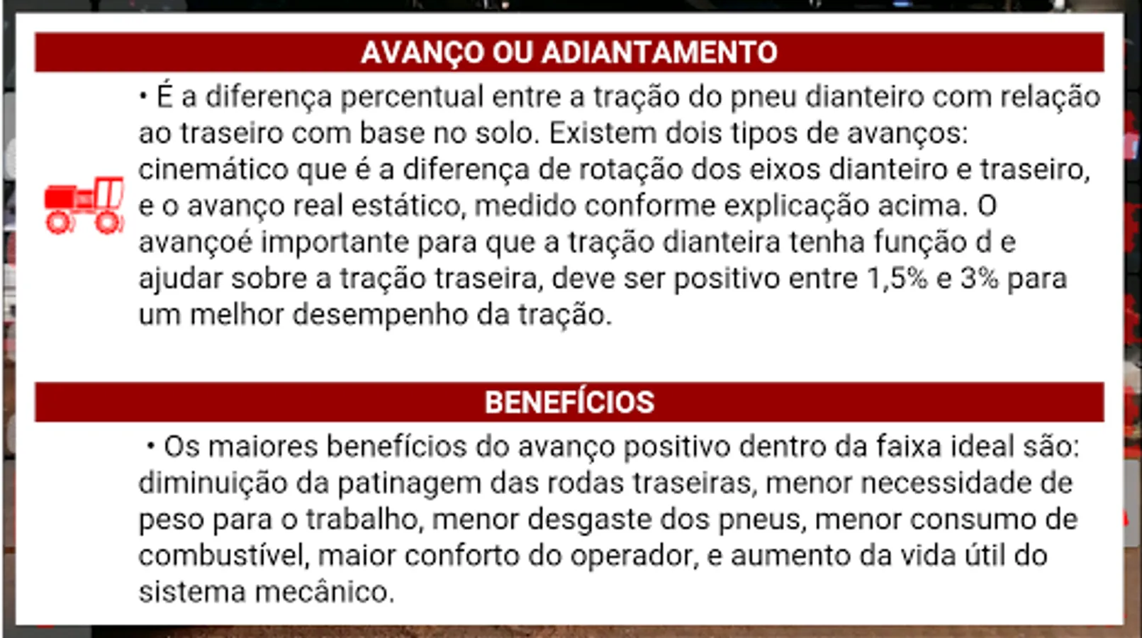 • It is the percentage difference between the pull of the front tire with respect to the rear ground-based equipment in 4x4. There are two types of improvements: cinemático which is the rotation difference of the front and rear axles, and the actual static feed, measured as traction on the ground. The advance is important so that the front wheel has auxiliary function on the rear wheel, should be positive between 1.5% and 3% for better performance traction.