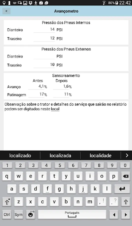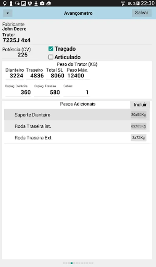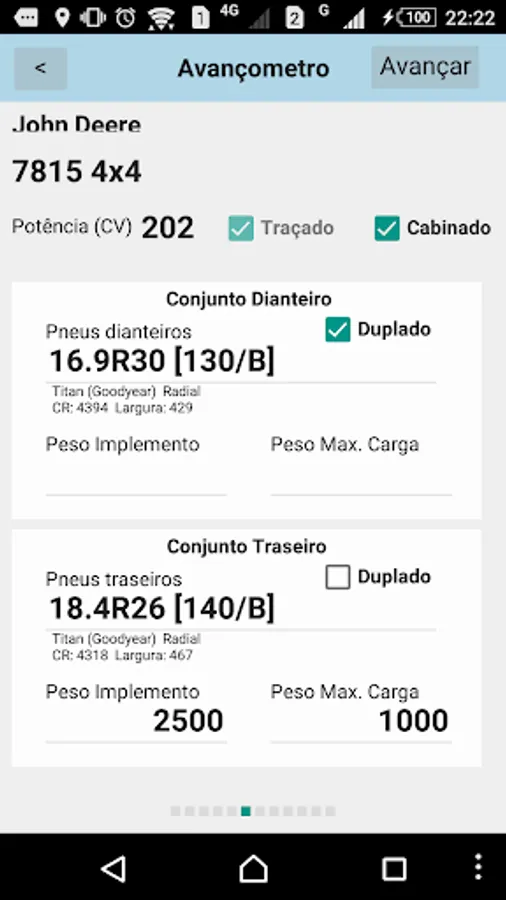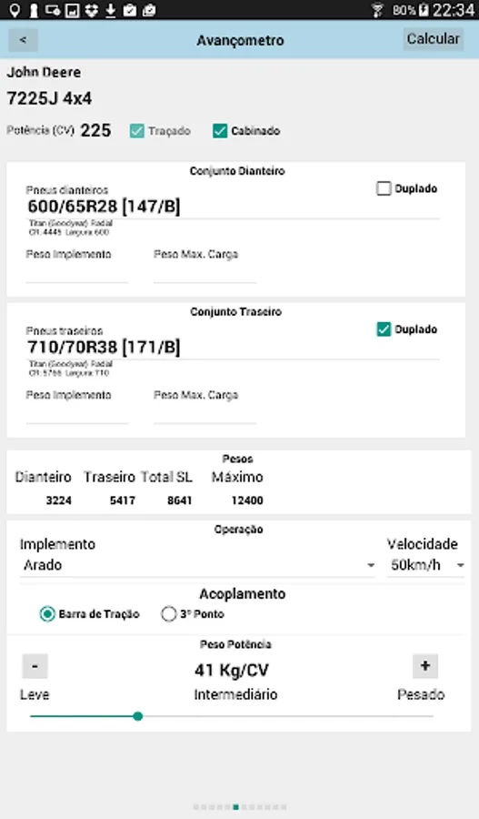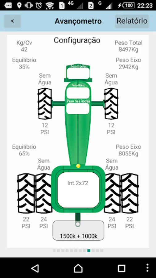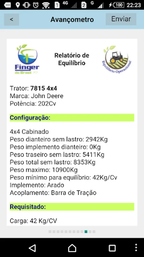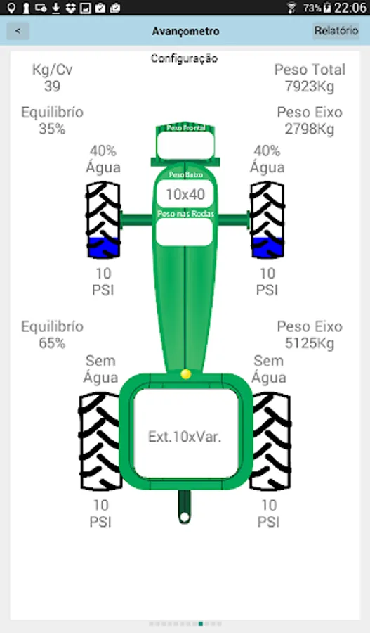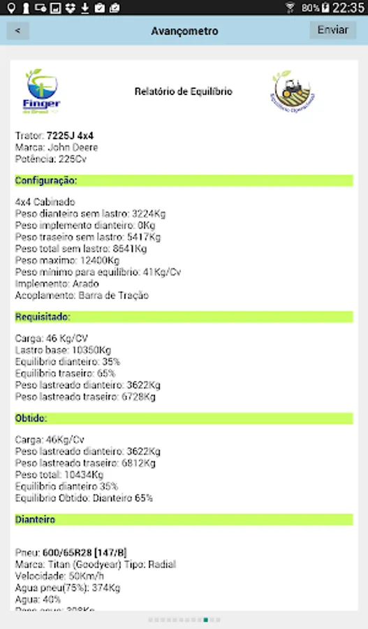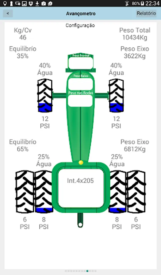 App Operating Balance performs the necessary calculations for the best tractor balance for each agricultural operation, based on data from tractors and tire manufacturers, provides the data to fit the tractor, front, rear weights in specific locations as supports and wheels calculates the water level required for the job and informs the correct minimum pressures for each tire single or dual axis, summarizing everything in a report in PDF format for sending via e-mail which can be shared with manufacturers for aid and evaluation of the technical settings applied to the machine.