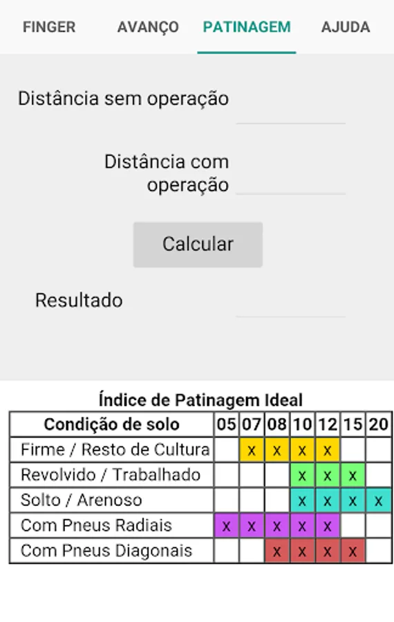 The skating calculation identifies the slip traction on the ground. Incorrect skating indexes can cause discomfort to the operator, high fuel consumption, loss of income and excessive tire wear. And endangers the mechanical system at very low patinagens cases.