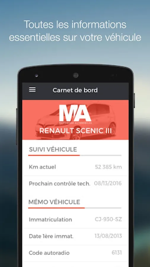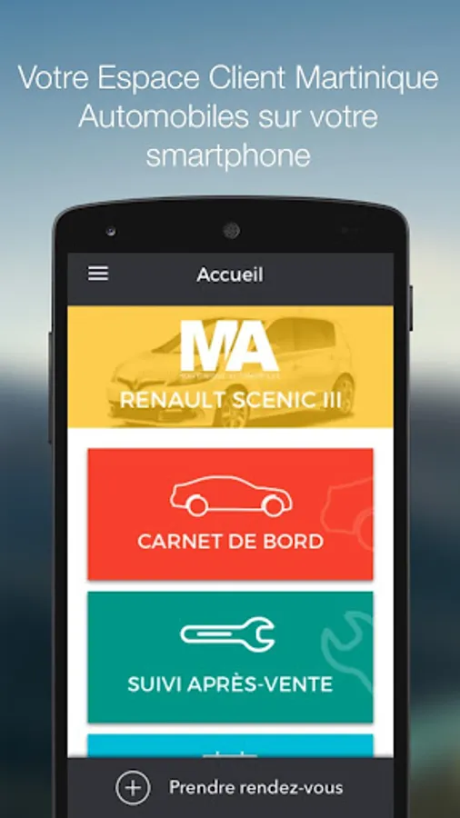 Martinique Automobiles, application Customer of your car dealership. A simple and secure access to take an appointment online workshop, track the status of work on an appointment ongoing access to technical information of your vehicle, check the history of your after-sales service, receive your invoices in PDF format, please contact your dealership and assistance services.