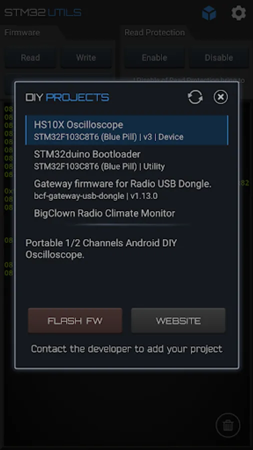 Easy flashing of STM32 Chipsets on the fly. Choose among several available DIY projects with available firmware to start with or flash your own firmware.