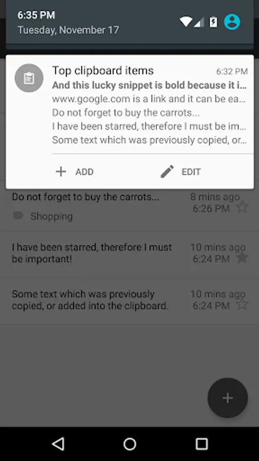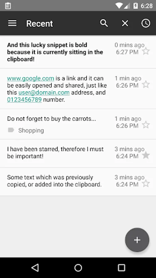 Clipboard + Notes (previously known as 'Clipboard Contents') is a simple clipboard manager which watches your clipboard for any changes and saves its contents for later use. Contents can be starred and labelled, as well as added manually, which makes the app a handy tool for note taking.