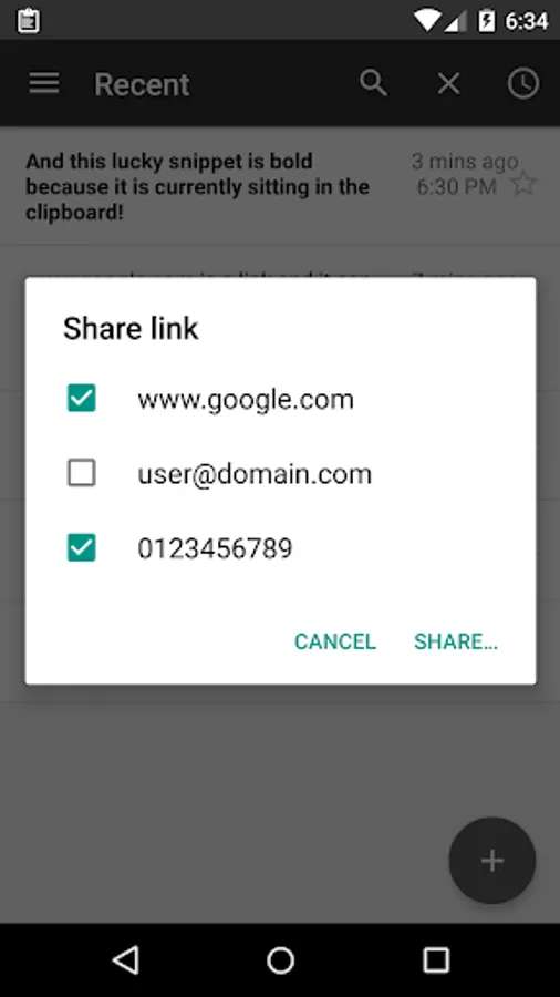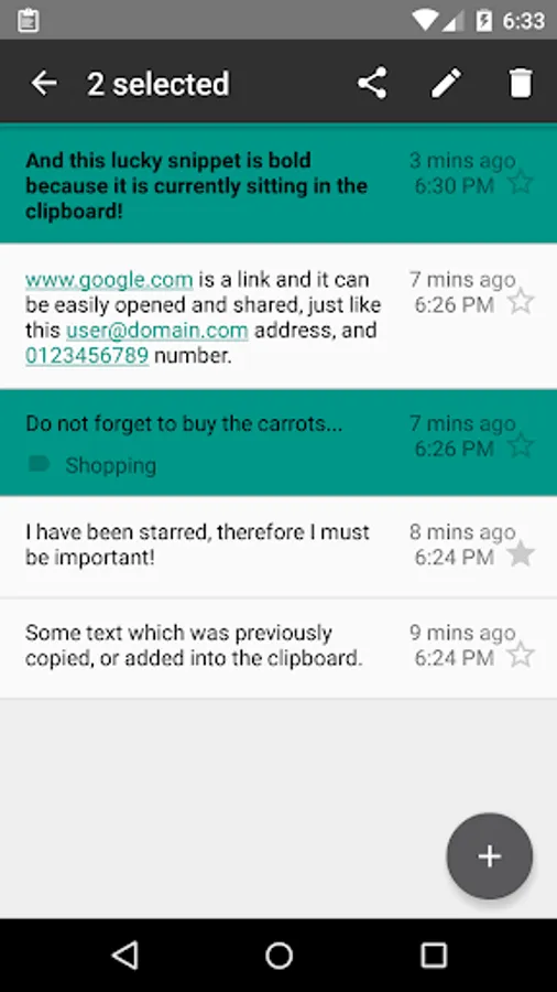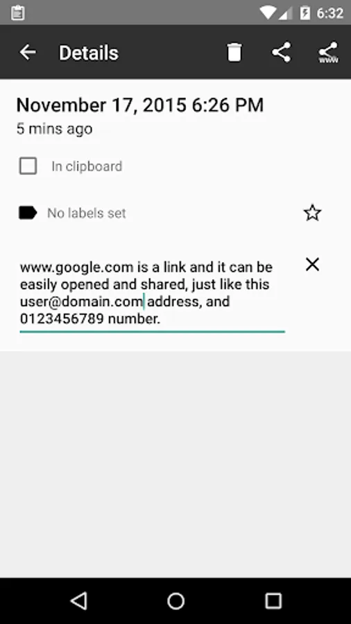 The contents from the clipboard history can be copied into the clipboard again, they can be edited, deleted, searched, and shared too. When sharing links they can be optionally shortened if URLy is installed. Any links in the contents will be quickly picked up and extra options will be available to open or share them directly from the device. HTTP and Market links are amongst the supported types.