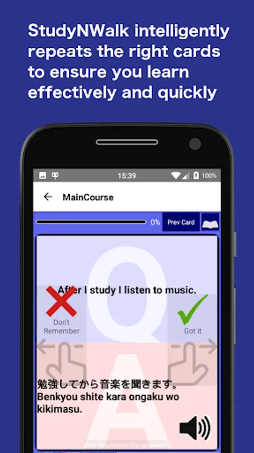 StudyNWalk allows you to learn anywhere you can use your phone. Even when you are outside walking, switch to Walking mode and study with voice prompts when others are just listening to music. Imagine learning on the train but then you can keep on going even after getting off and walking to office!