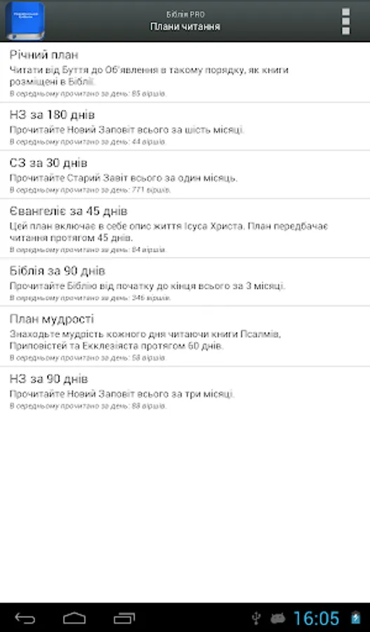 - Reading plans: multiple reading plans for reading the Bible in 30, 45, 60, 90, 180 or 365 days