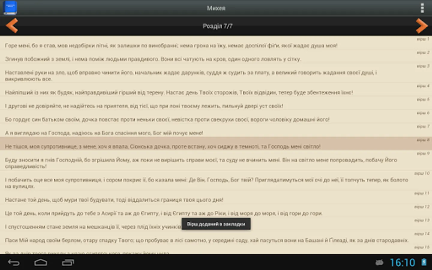 - Keep reading from the last verse you read with just one touch!