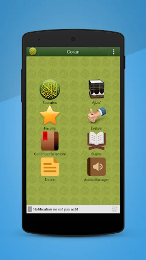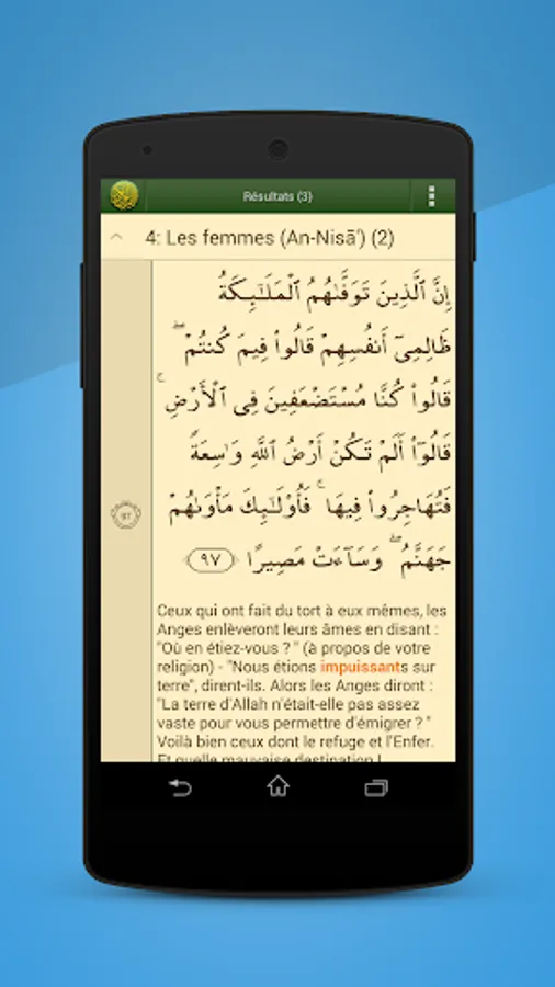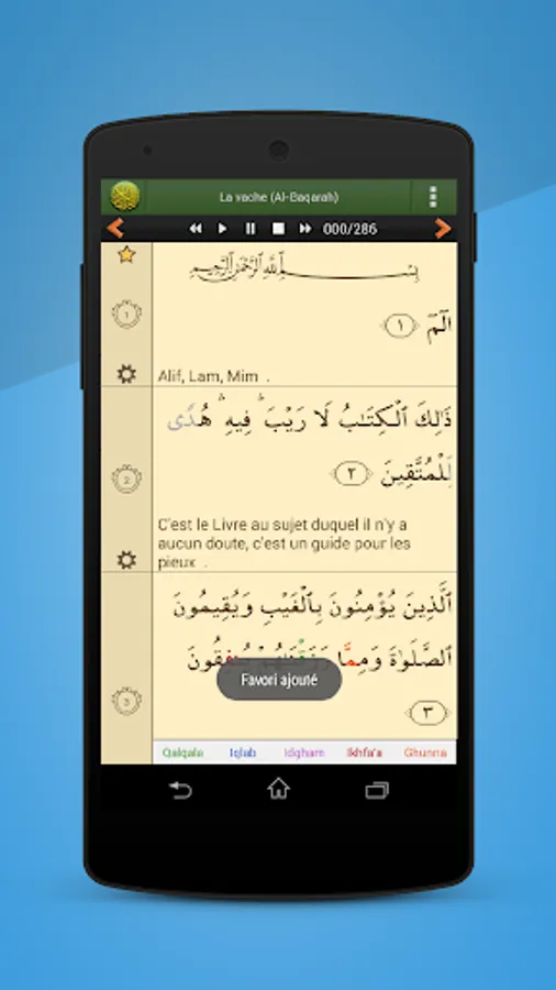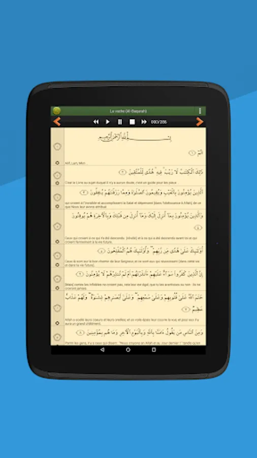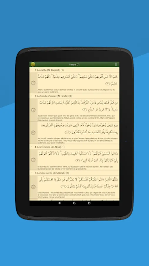 - Read the Quran in Arabic alongside its French translation.