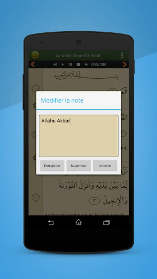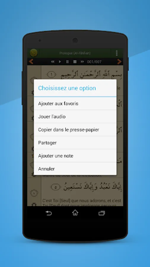 - Long press on an ayat will allow you to add it to your favorites, share with social networks or add notes.