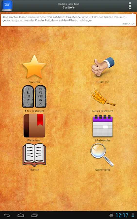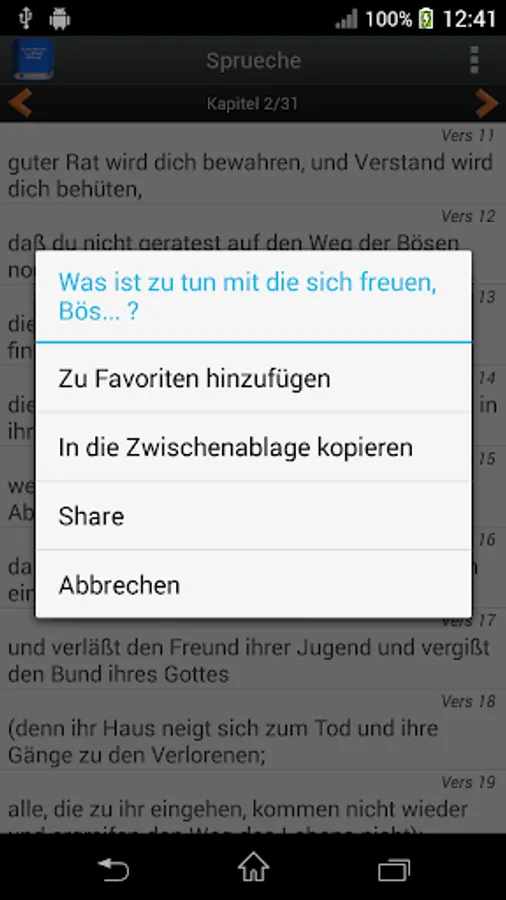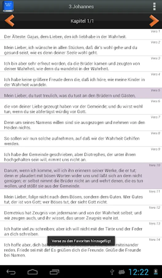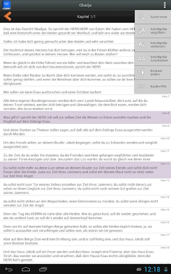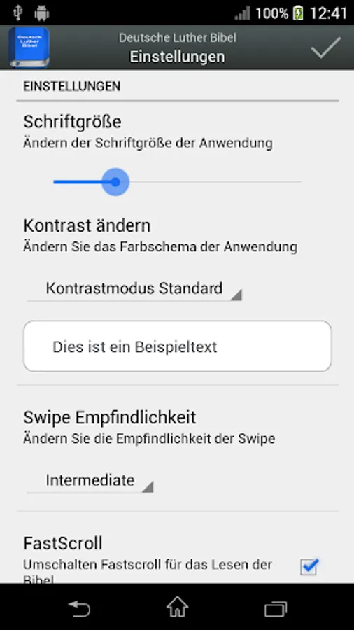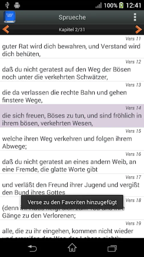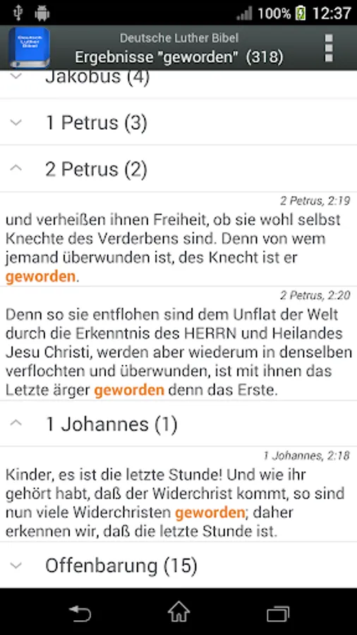 - Contextual Search: Search within the whole Bible, a testament, a book, a chapter or within a day from the Bible reading plan. The search term is marked within the search result.