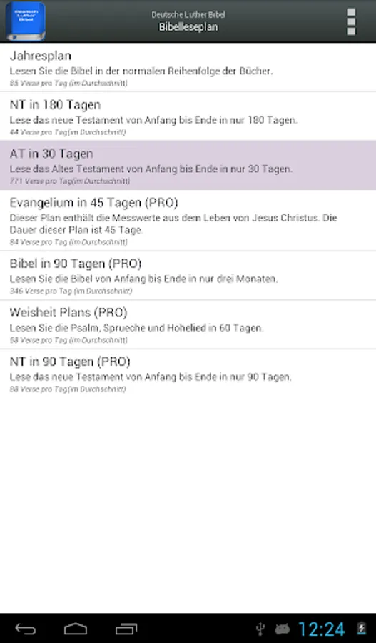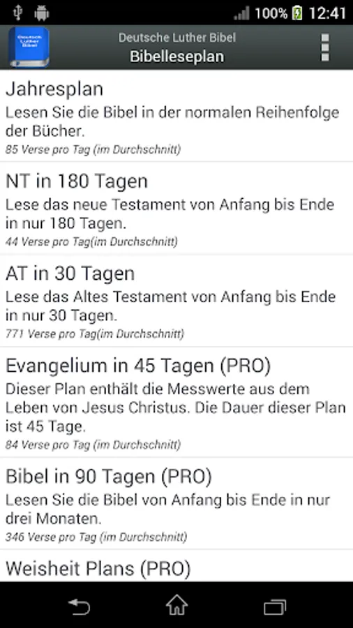 - Reading plans: Special reading plans to read the Bible in 30, 45, 60, 90, 180 or 365 days (some of them are only available in the PRO version).