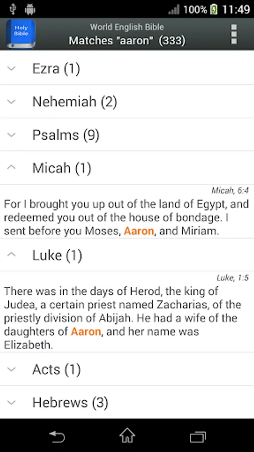 - Contextual search for terms: clicking the search icon you can search within whole Bible, a Testament, a Book or even a Chapter.
