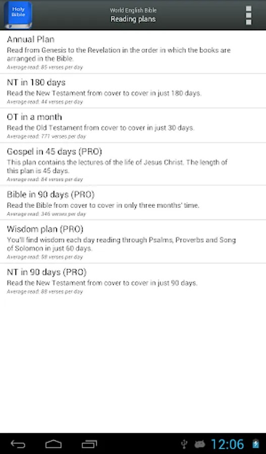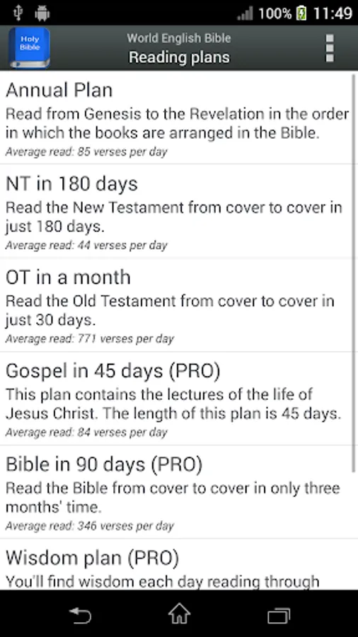 - Reading plans: several reading plans to read the Bible in 30, 45, 60, 90, 180 or 365 days. (Some plans are only available in PRO version).