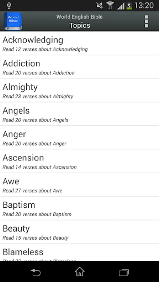 - (NEW) Topics: read a selection of verses on more than 100 different topics from the Bible.