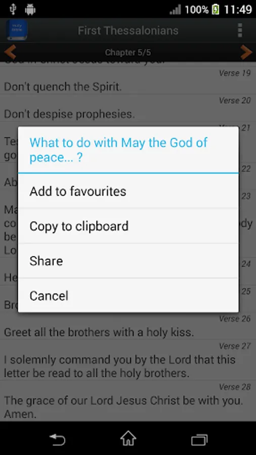 - A long press over a verse will addc it to favourites or let you share it on social media and messaging apps.