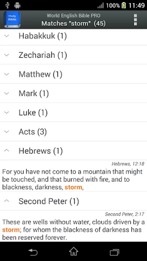 - Contextual search for terms: clicking the search icon you can search within whole Bible, a Testament, a Book or even a Chapter.