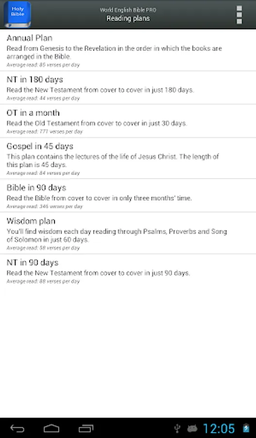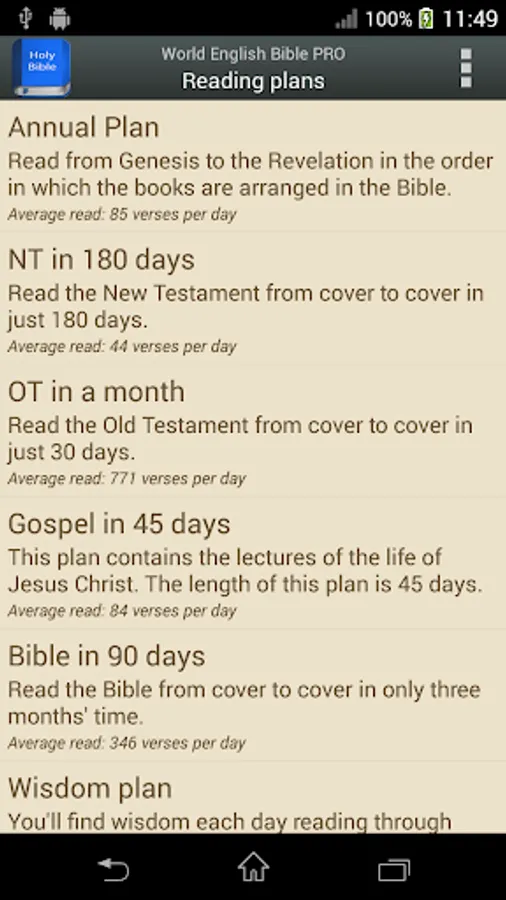 - Reading plans: several reading plans to read the Bible in 30, 45, 60, 90, 180 or 365 days. (Some plans are only available in PRO version).