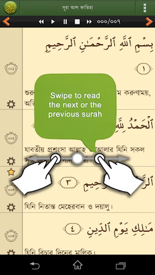 - Swipe from left to right to go to the previous surah or from right to left to go to the next surah.