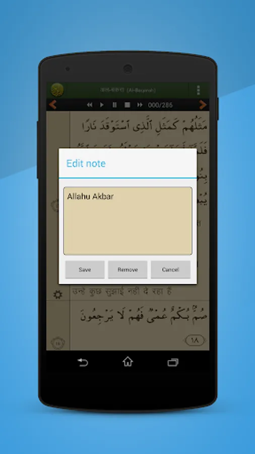 - A long click over a verse will add it to bookmarks, share it on social media or messaging apps, or attach notes to it.