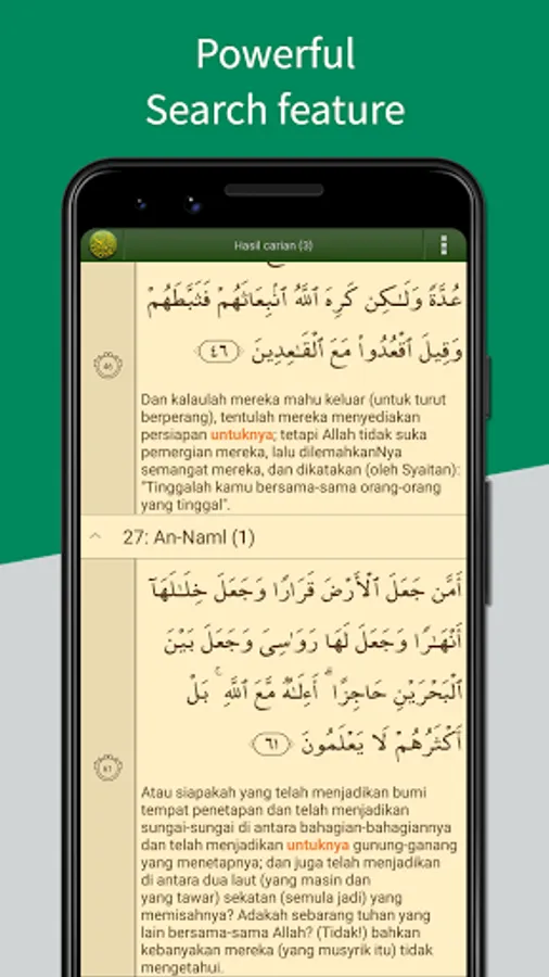 - Search by clicking the search icon. You can search throughout the Quran, in Juz or in any surah.